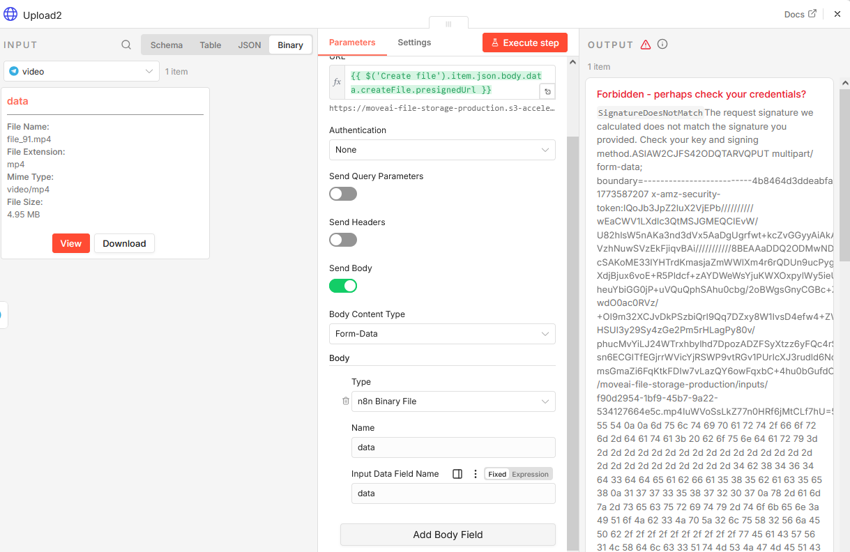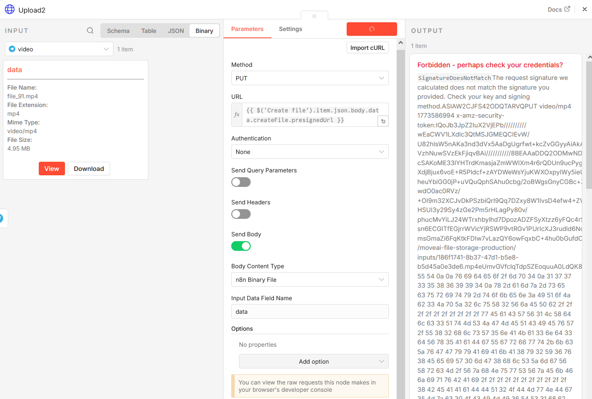 Have you tried setting up the body content type to n8n binary file instead of raw data? And i am assuming that content type headers are matching the content type used to generate that URL, cause most of the type any mismatch between URLs causes this S3 return 403 errors.