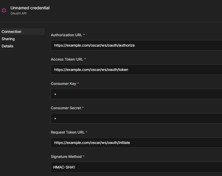 Here’s a minimal, Docker-friendly Node OAuth1 signer/proxy you can run next to n8n. It takes a simple JSON payload from n8n, signs the request with your consumer key/secret + Postman access token/secret, forwards it to OSCAR, and returns the raw response.