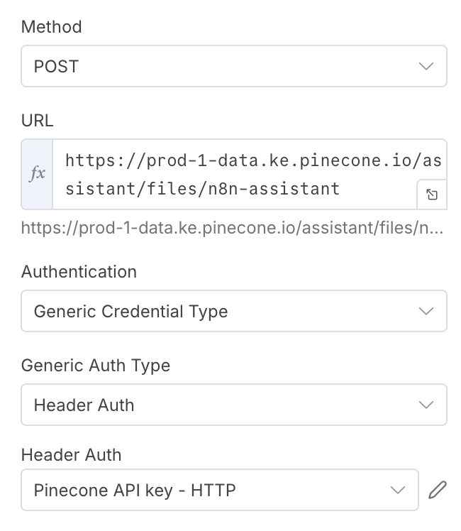 I succeed to call PineCone Assistance chat via HTTP Requests node , however it's not work at Upload files , Lists files. I use this manual but it's still not working. https://docs.pinecone.io/reference/api/2025-04/assistant/upload_file