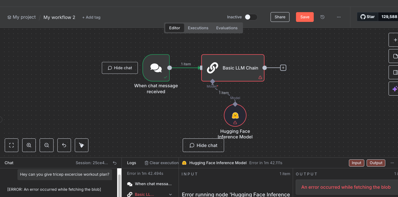 While integrating the Hugging Face Inference API with a workflow, the following error appears in the node “Basic LLM Chain”: