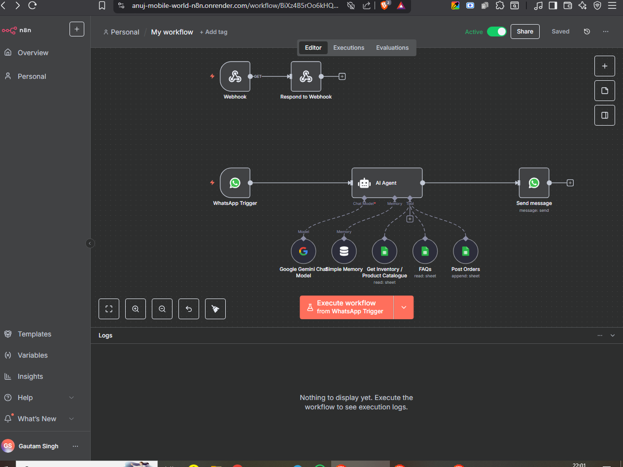 when I clicked on execute workflow button and messaged first time on whatsapp the n8n execution replied back but STOPPED , And when i messaged 2nd time nothing happened PLS HELP