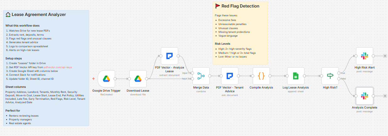 Most people sign a lease after skimming it for 10 minutes. The auto-renewal clause on page 6, the early termination penalty buried in section 12, the vague maintenance language that lets a landlord argue anything — you don’t catch those in a skim. Built a workflow that reads the whole thing and tells you what to watch out for.