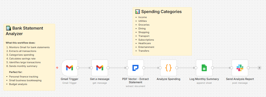 Watches your Gmail for bank statement emails, extracts every transaction, categorizes your spending automatically, calculates your savings rate, and sends you a Slack summary. Takes about 8 seconds per statement.