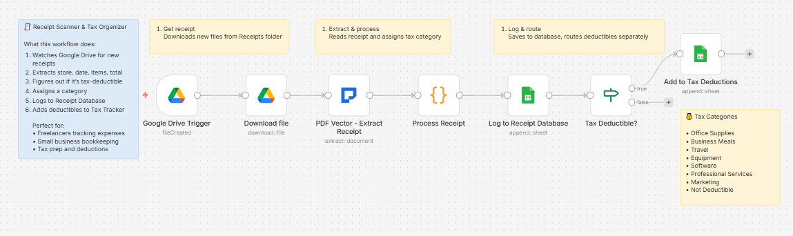 Watches a Google Drive folder for new receipts, extracts everything, figures out if it’s a business expense, and splits deductibles into a separate tax tracker automatically. Takes about 7 seconds per receipt.