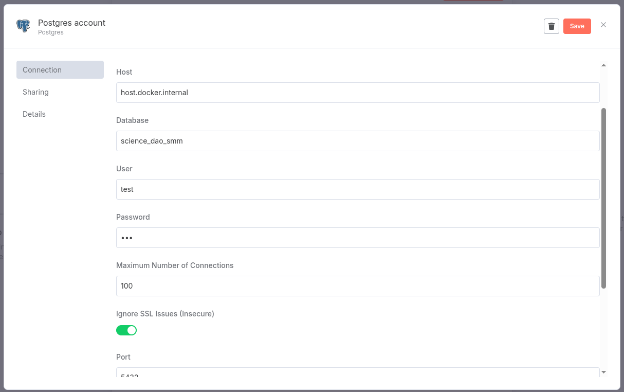 Then use localhost in n8n: postgres://test:123@localhost:5432/science_dao_smm