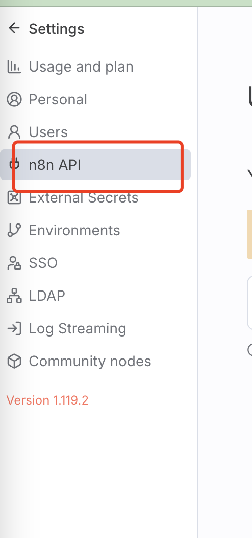 I’m trying to create an api_key. I searched and found the steps to do that, but I couldn’t see “n8n API” in Serttings.