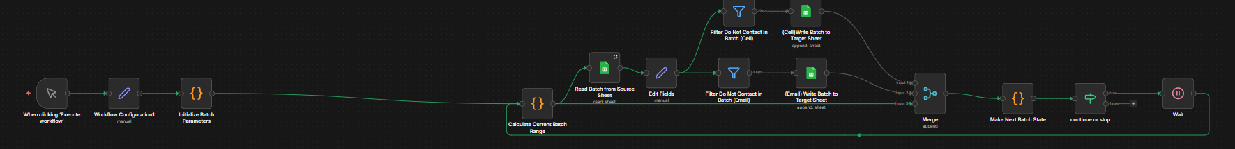 Read → Split in Batches → Filter/Transform → Append → back to Split in Batches.