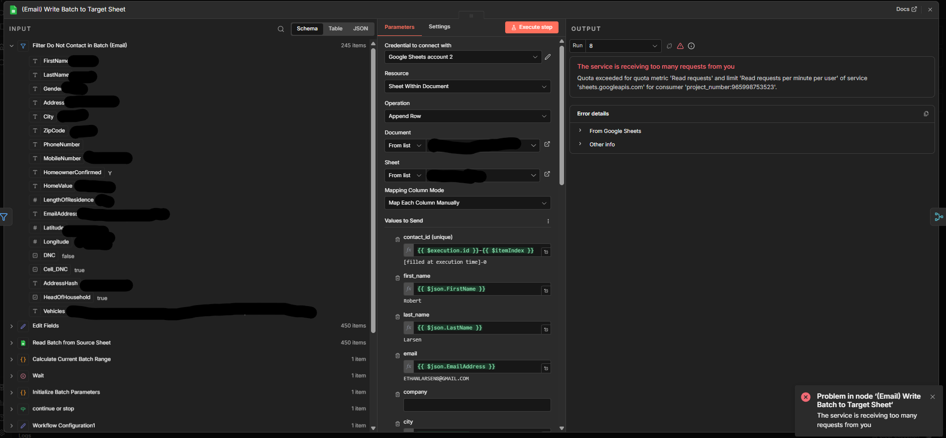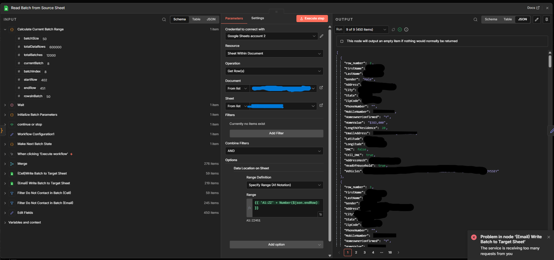 @Anshul_Namdev Thank you for the response. I worked on it a little bit. It is reading through the workflow properly. The only problem is that it is now writing into the spreadsheets 0-32, 0-64, 0-90, 0-122…. So it will break the write code eventually because it will request too much data. Chatgpt sends me down some loops that I have tried multiple times so your help is greatly appreciated.