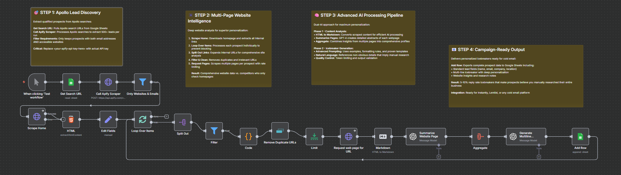 Hey guys, here’s a great, working workflow that creates personalized cold emails I’d love to put into Instantly.ai for outreach. Unfortunately, it’s way too slow — it currently takes about 3 minutes per lead — so uploading 1000 leads just isn’t feasible.