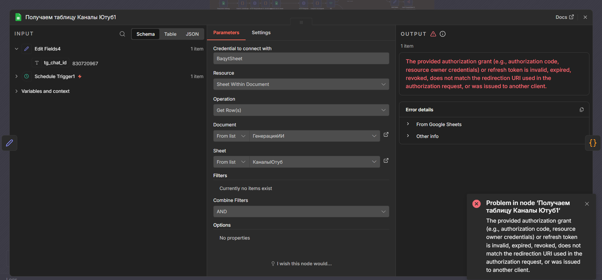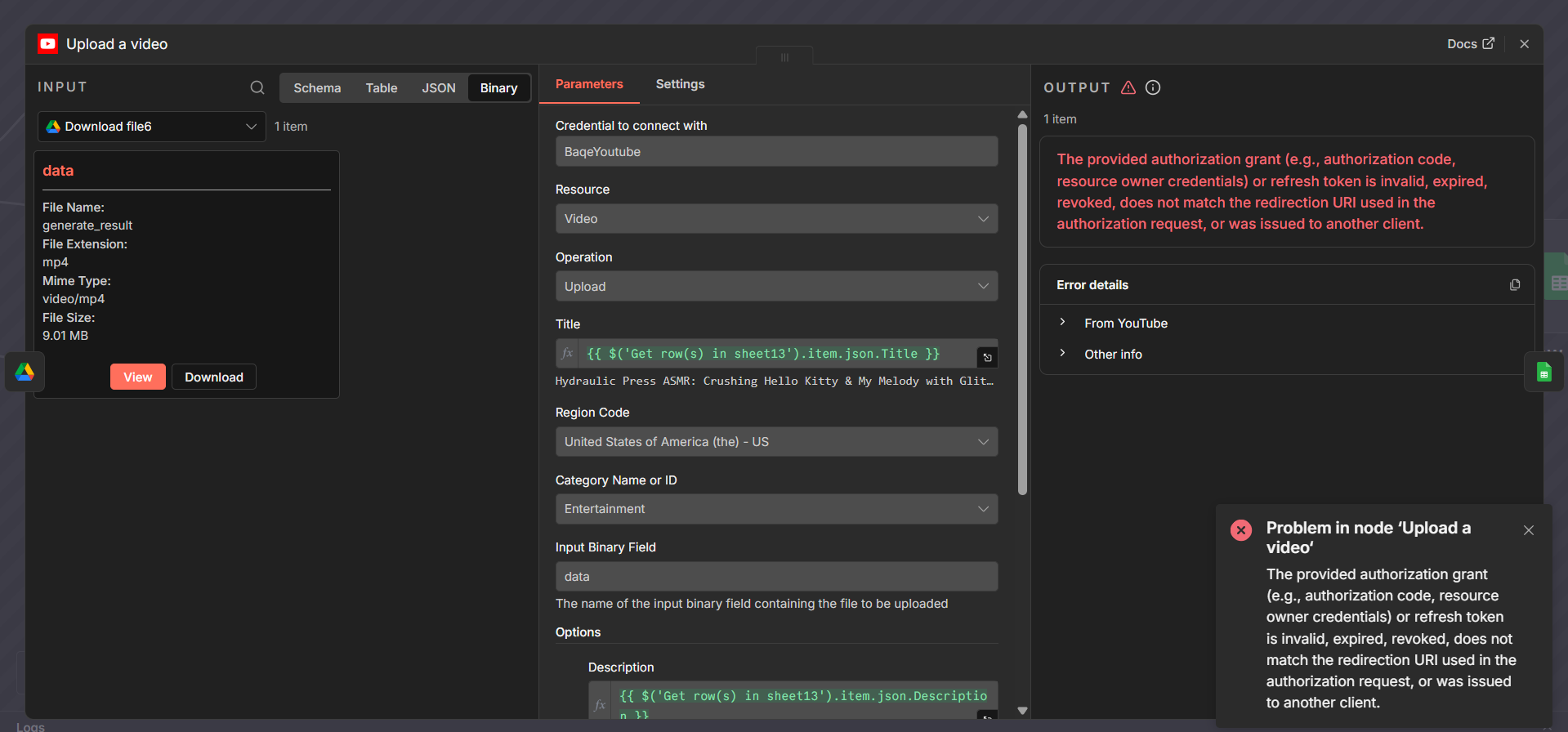 I launched my automation workflow, which uses YouTube, Drive, and Sheet nodes.