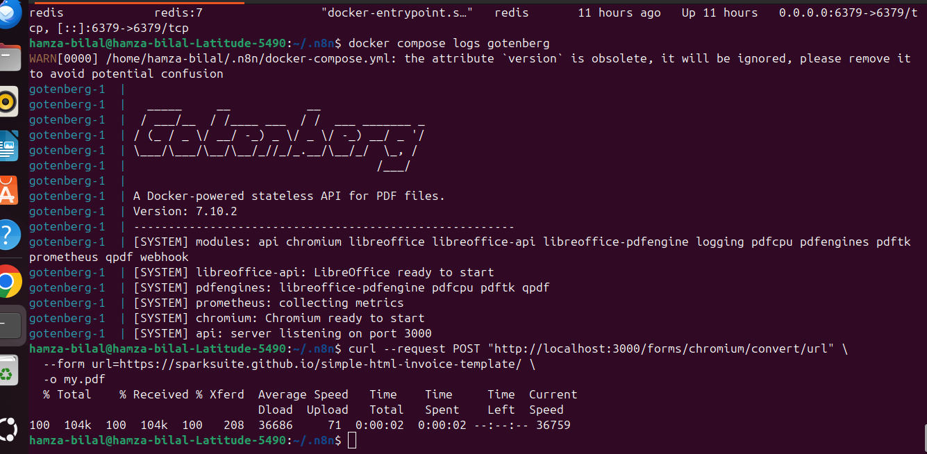 I have went very quickly on the Gotenberg docs ( Installation | Gotenberg ) and I see that you can directly call the API (http://localhost:3000) but before doing anything with n8n setup, can you please make sure that Gotenberg is already working properly, can you please run the below in the terminal:
