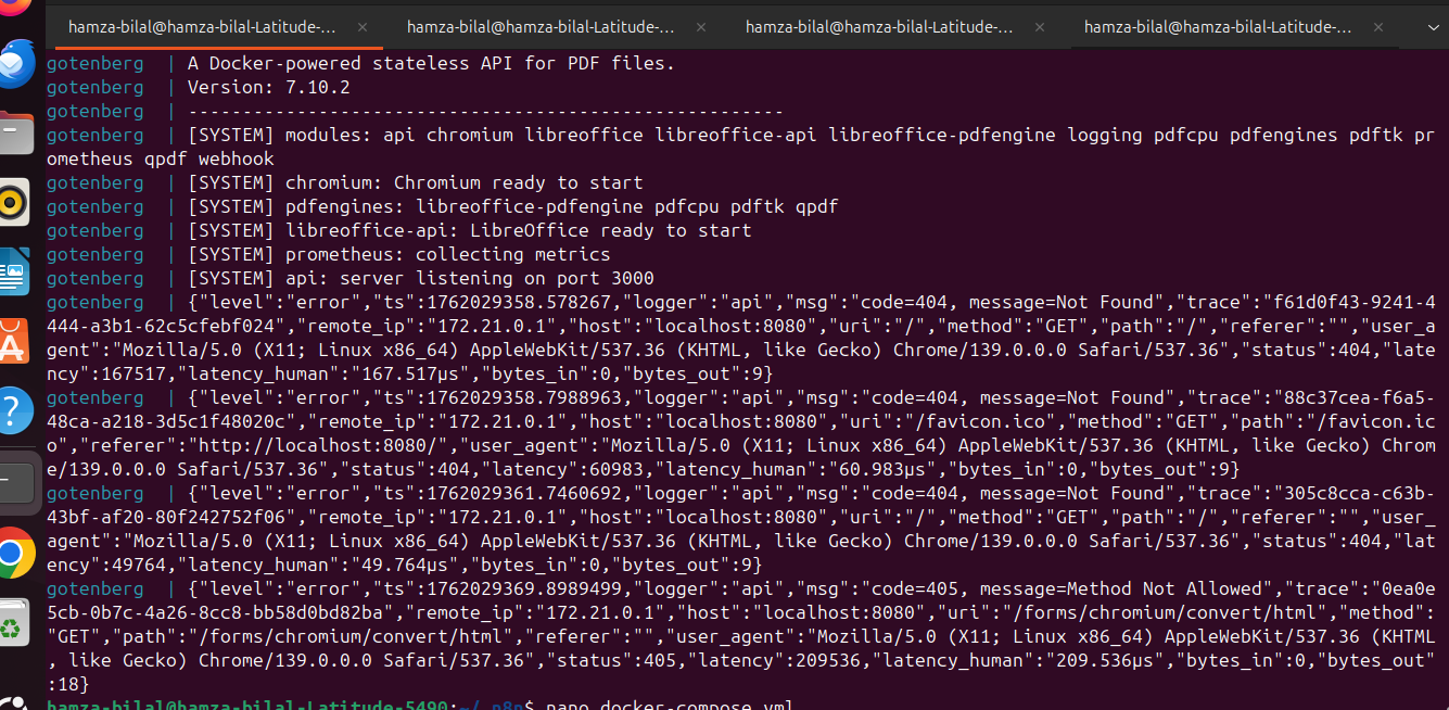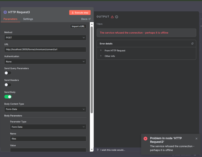 I Am using n8n in docker , Generating PDF using Gutenberg i added the image of this in docker-compose.yml and access with this url http://gotenberg:3000/forms/chromium/convert/html But Same it shows the error