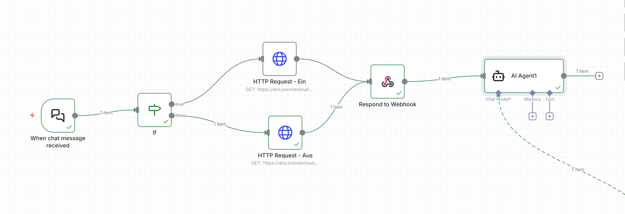 So this is my current n8n workflow for this part - the if node will determine if the current time is between 10am and 3pm, if it’s yes, the workflow processes the HTTP Request Ein (on). Otherwise it processes the HTTP Request Aus (off). This workflow is to assist the AI agent node while it determines if the heat pump runs efficiently or not.