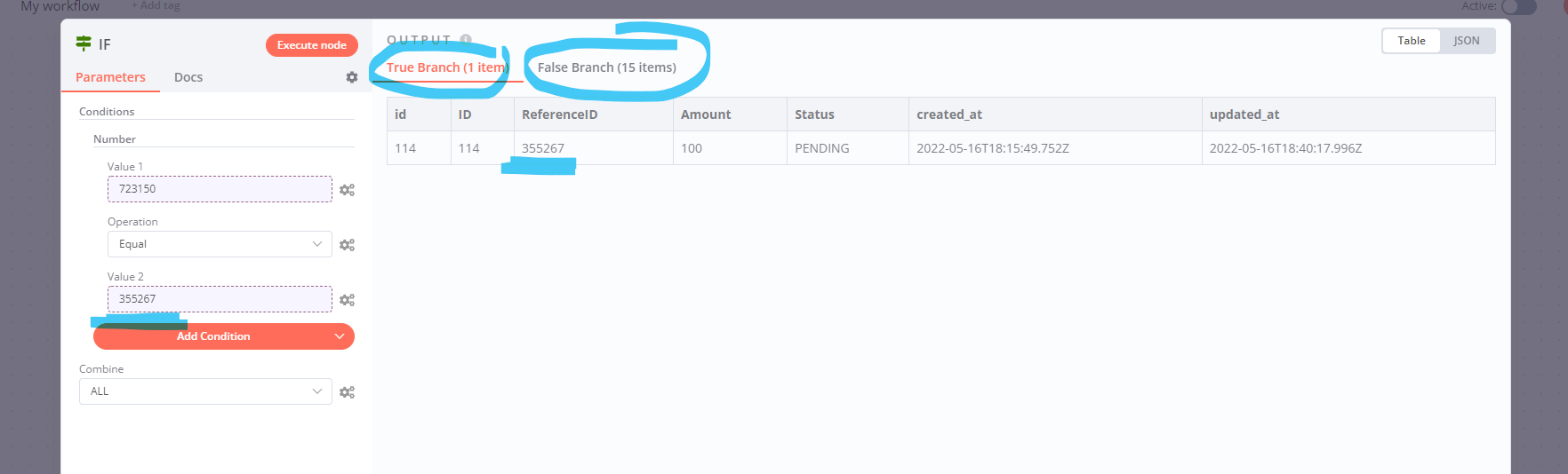 I’m trying to filter the records using “ReferenceID” from the “Split into items” node in Value 1 in Expression. Then set the Value 2 in Expression to get the “ReferenceID” from the webhook.