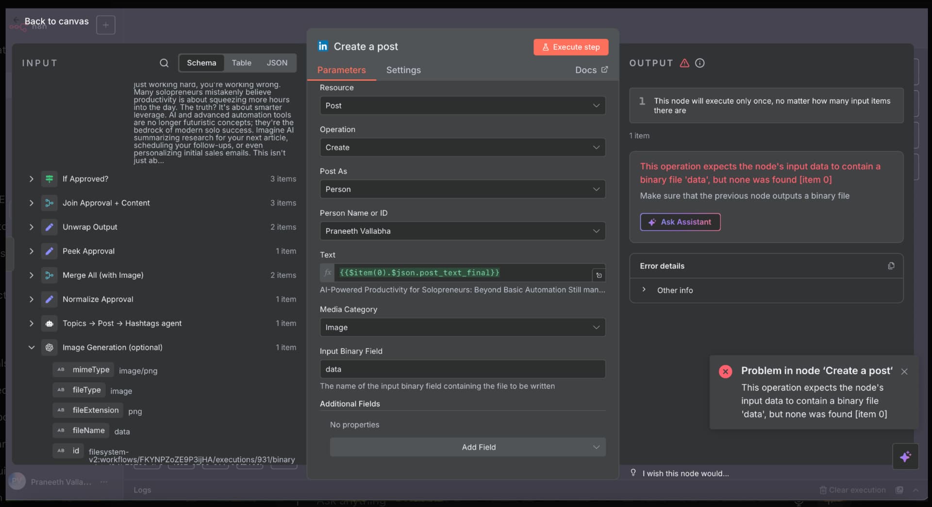 somewhere done the flow it is not creating a binary data, or passing it, so the final LinkedIn don’t receive the binary data. Can’t seem to figure it out on how to solve this issue