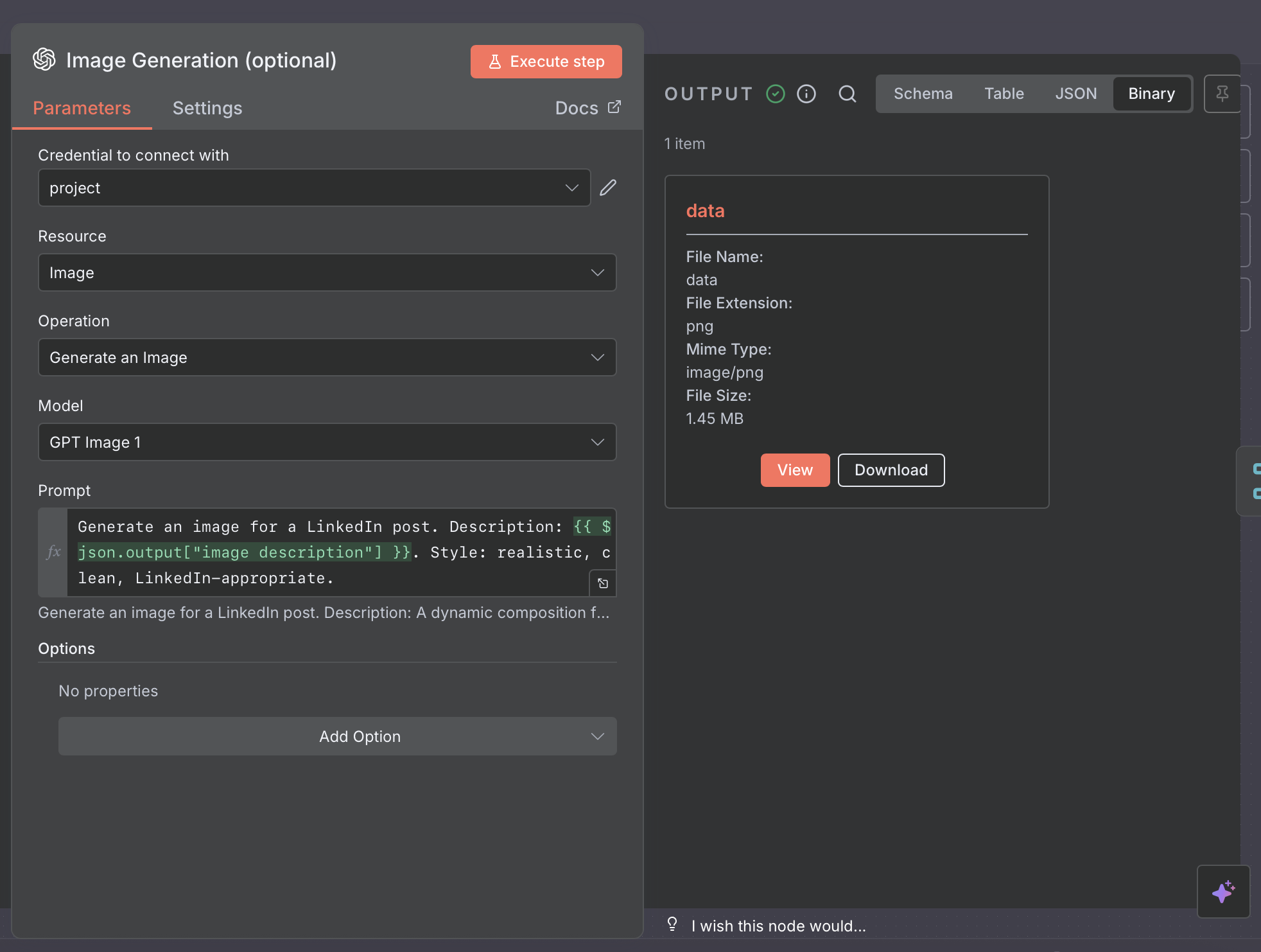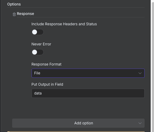 Note: If there is an option in the OpenAI node called ‘Response’ add it and select file response type. Built-in n8n HTTP Request nodes have that option (refer to image)