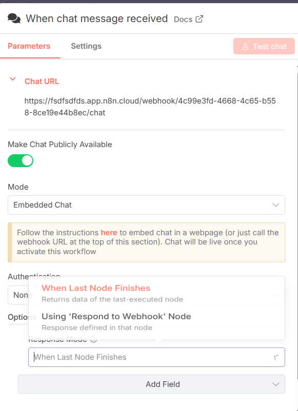 Once updated, you’ll see the Using response nodes option in the Chat Trigger → Response Mode.
