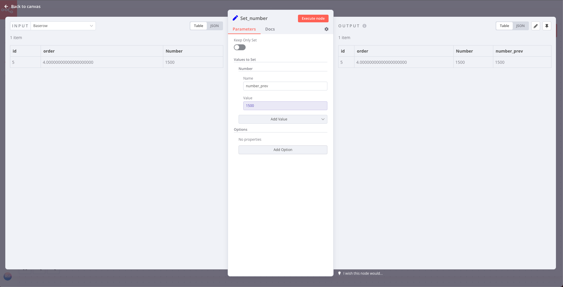 In the following sequence, you bring the last value of a table in Baserow, add the value 500 and save it again in the same table, so that in the next execution the workflow will start at 500,1000,1500, etc.