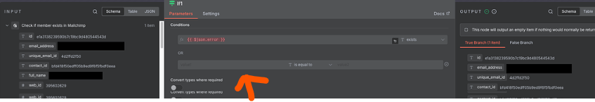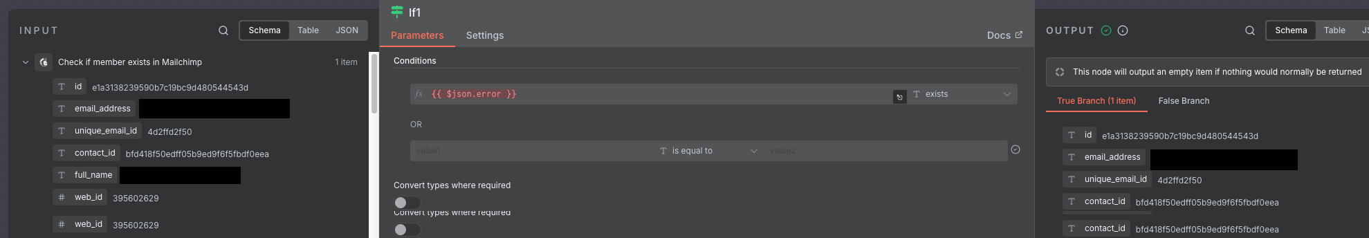 I have a problem defining the IF node after the check in Mailchimp. Here the output looks really different when a user already exists or when it doesn’t, so I don’t know what field to check in the IF node.