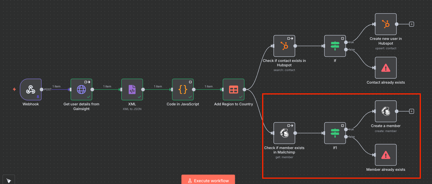 The overall workflow checks for new users in Gainsight, takes that data and puts it into Hubspot and Mailchimp. For both Hubspot and Mailchimp I need to check whether that new user already exists (the user could have signed up through other channels).