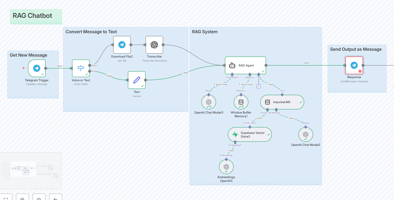 My workflow is based on the official “Company RAG” template: Telegram Trigger → (process voice/text) → RAG Agent → Telegram Send Message ( Company Knowledge Base Agent (RAG) | n8n workflow template )