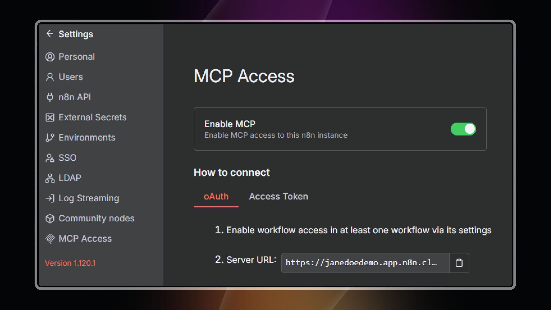 In n8n, go to instance Settings → MCP Access and enable MCP access.