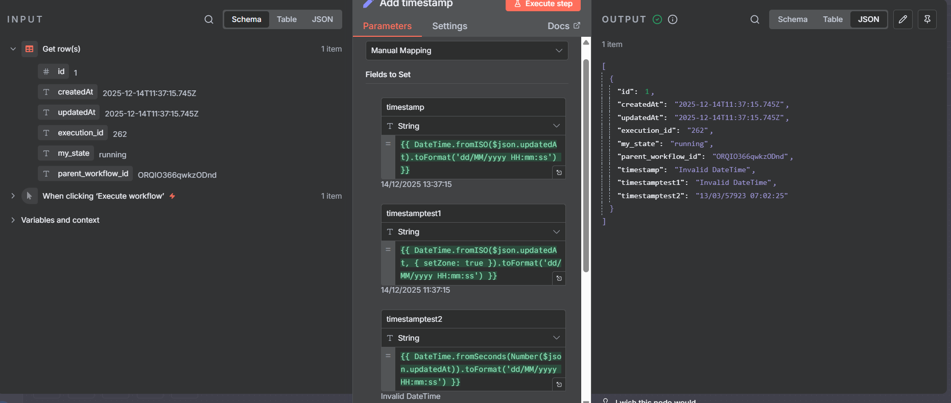 Below I attached a screenshot from execution log. Here I use an Edit Fields node to convert the timestamp I get from a Data Table → Get Rows node. The preview shows it should work fine, but the actual output gives me “Invalid DateTime“.