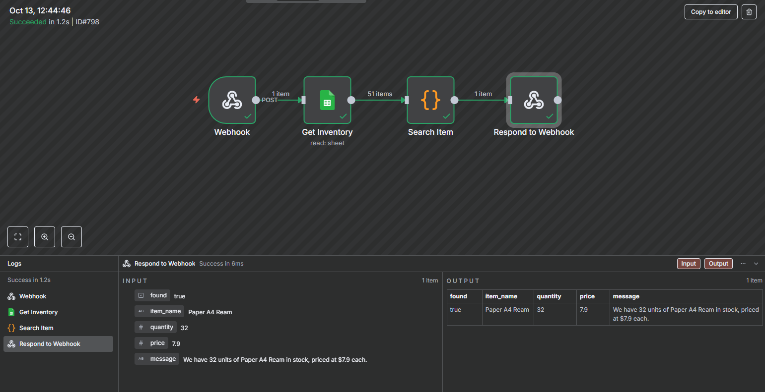 In theory, I want to be able to call this assistant and then ask about an item in inventory, it should then search the closest matching item and return back the price and quantity in the google sheet.
