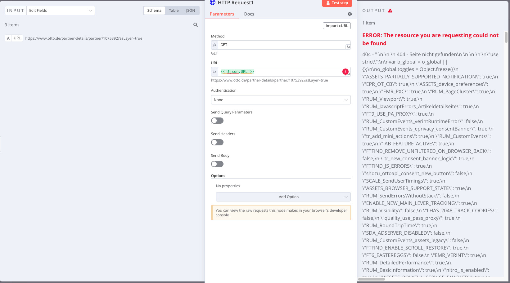 When I use a static URL (in this specific example, "https://www.otto.de/partner-details/partner/1075392?asLayer=true") directly in the HTTP Request node, it works fine and I get the expected response. However, when I try to use a dynamic URL (in this case, {{ $json.URL}}) that contains the exact same URL, I get an error response from the API.