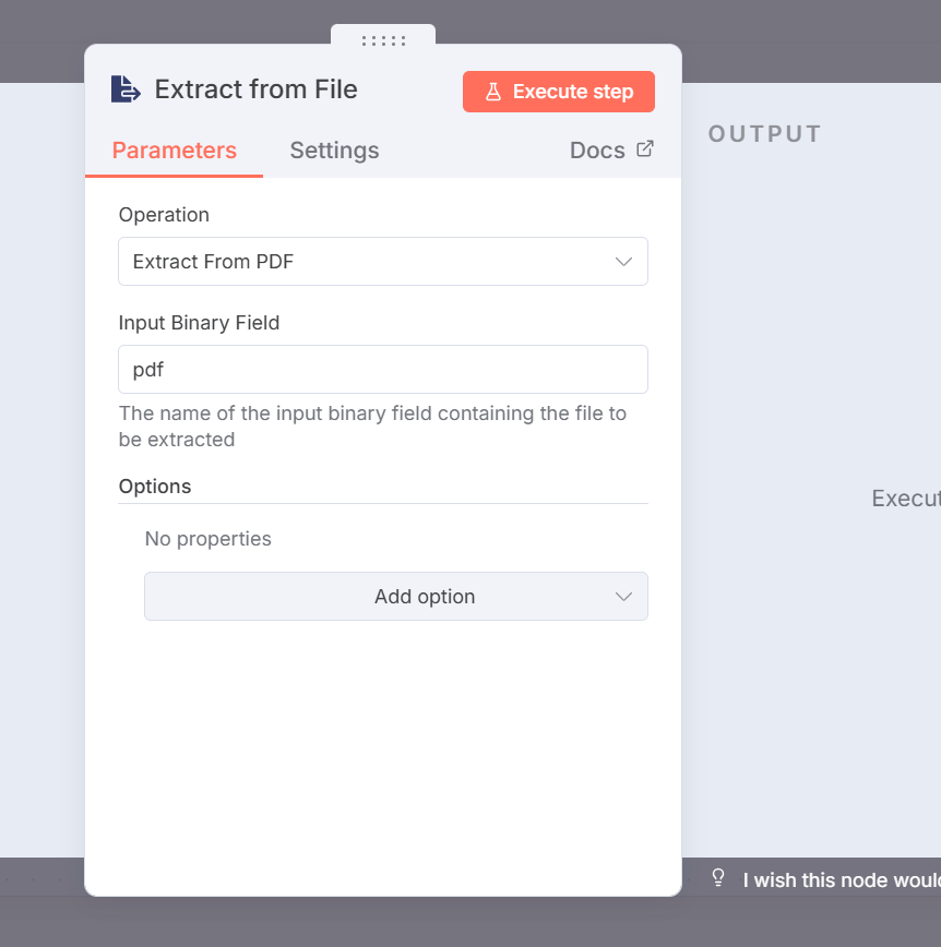 The Extract from PDF node should process the file and return extracted text without causing a server crash.