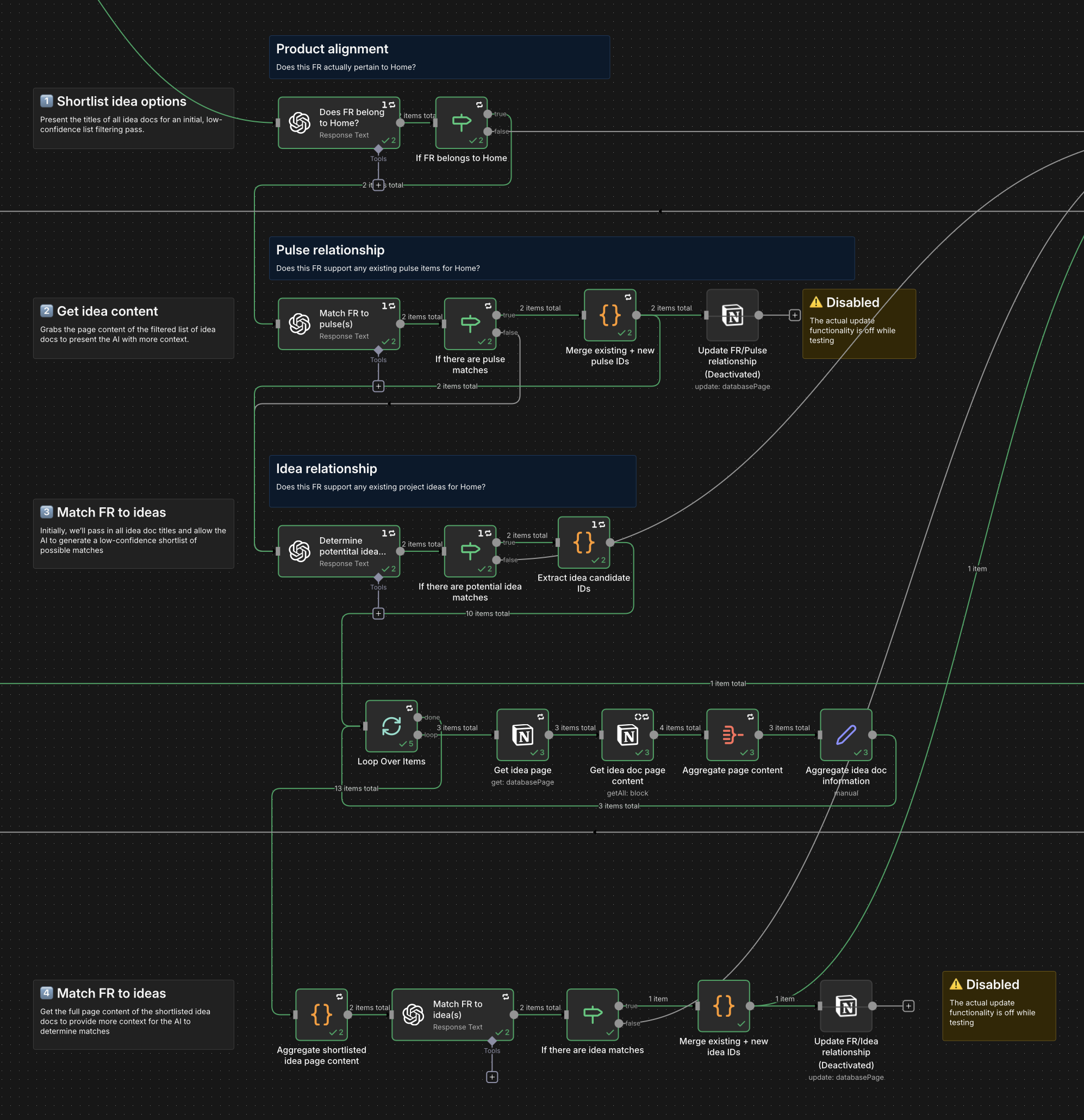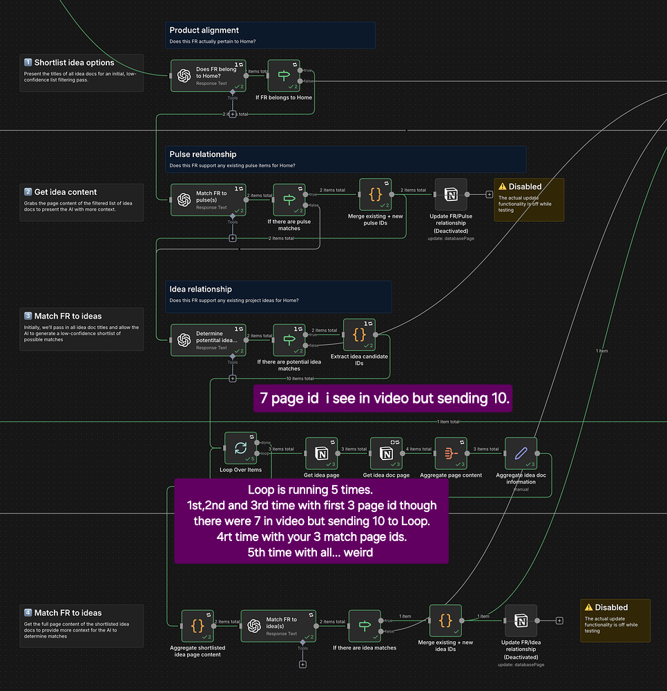 Then, the next step is I feed an AI node all of the product & FR information with all of the project idea titles so it can create a low-confidence shortlist of ideas that sound like they may be loosely related to the FR. I then take the IDs from this shortlist and loop through the ideas database and get the page content of every idea doc, aggregate it into a single object, and then feed into one final AI node which has all of the product context + FR content + title&content of all of the shortlisted idea pages to determine matches.