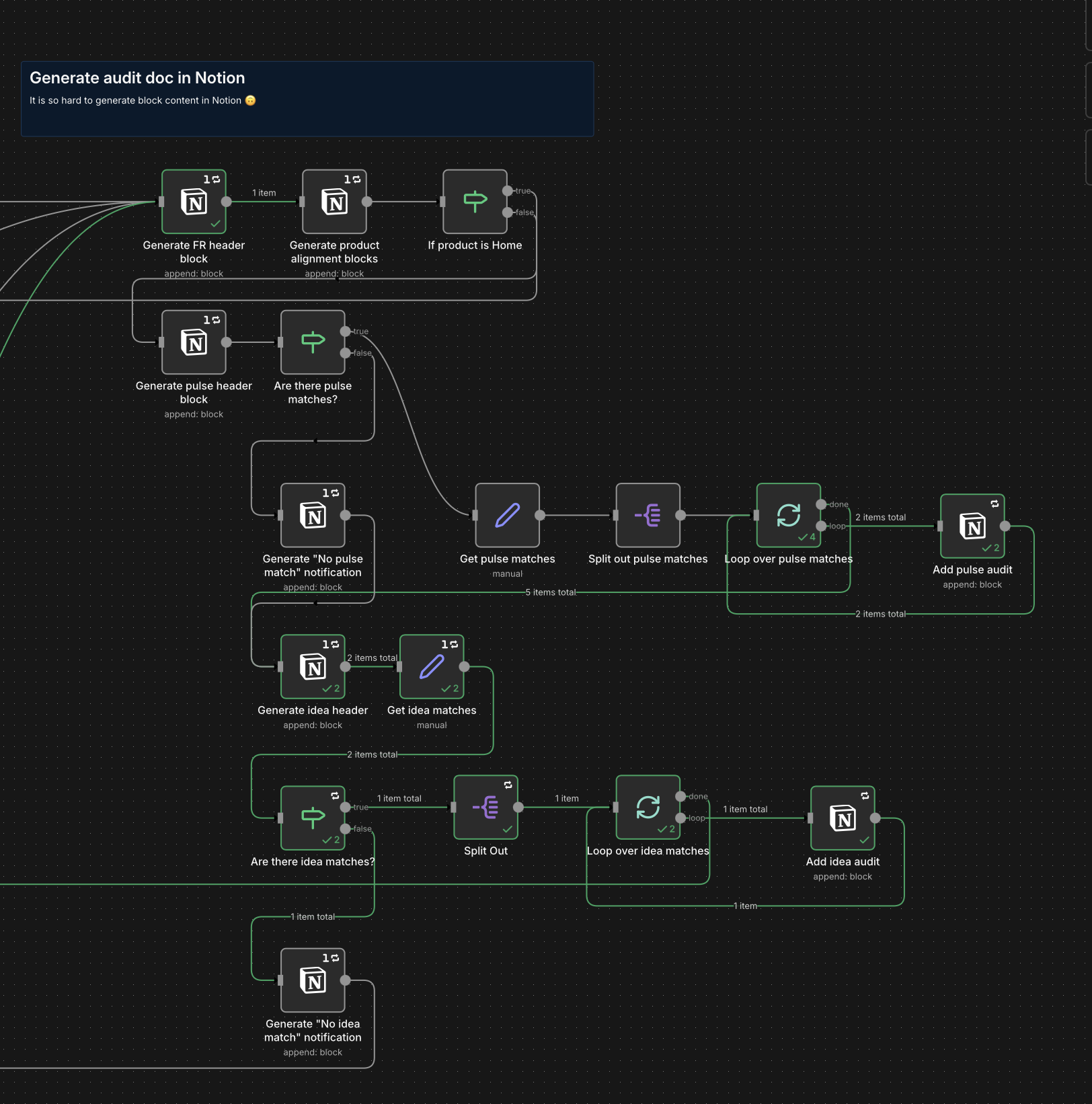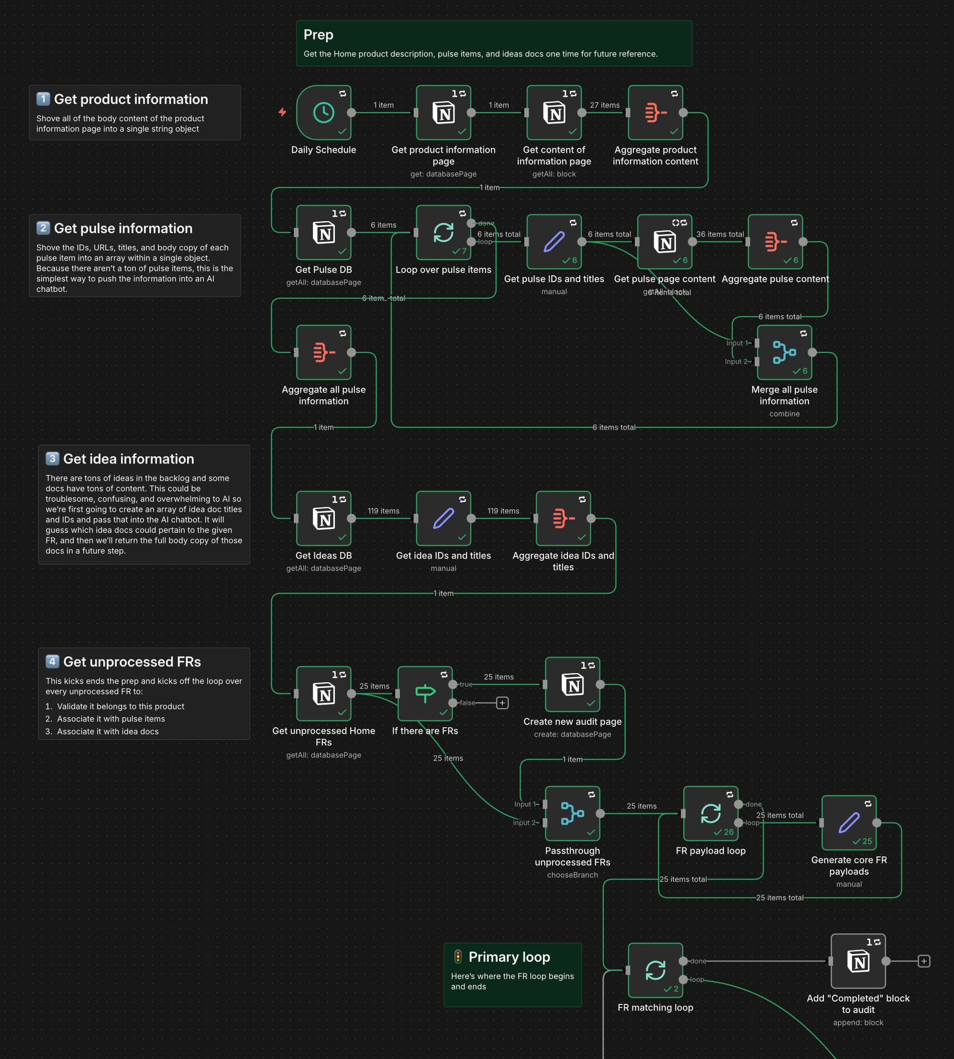 So my n8n workflow kicks off by getting product information from Notion as well as the entire pulse database for a given product (typically 10 or less pages with minimal body content). Then it gets just the titles and IDs of projects in the ideas database (typically 100+ with lots of body content for most products in our suite). Then I get all unprocessed feature requests and loop through them.