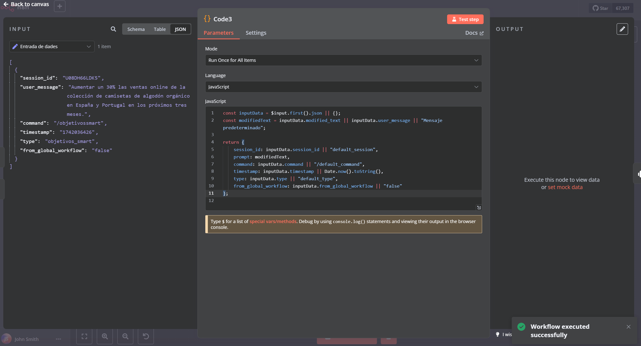 Initially, the loop went directly to the AI Agent, but this didn’t work (n8n showed a successful execution, but there was no output). To fix this, I added a Function node before the agent so that in the first iteration, it takes the original input, and in the following iterations, it uses the modified version.