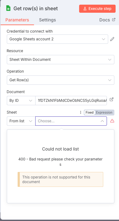 The problem here to me seems like it is a permission thing. If you cannot browse the google doc/sheet from the dropdown list, then either you are missing a permission in GCP or your user which you oauth with does not have access. This is why I recommend a service account as it is a more permanent user auth (oauth access might expire and then the workflow stops to work), and you can control what folders/docs the service account email can control.