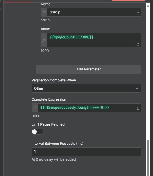 I’m trying to configure pagination for API requests in n8n, but I’m facing some issues. The API I’m using supports pagination through parameters like skip, returning 1000 records per request. I’ve set the skip parameter as {{ $pageCount + 1000 }}, but the request isn’t progressing as expected, and the data returned is identical across multiple iterations.