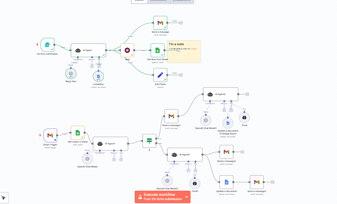 - The form data is passed to an AI Agent that generates a Google Doc based on the input.