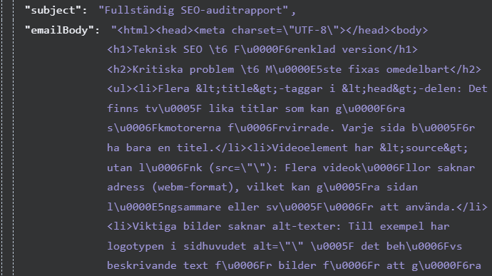 The problem: special characters (Å, Ä, Ö – since I work for a Swedish company and all drafts need to be in Swedish). They look perfectly fine in the logs, but when I receive the email in Gmail, about 50% of the time they get replaced by numbers instead.