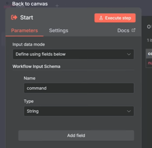 Navigate to your sub-workflow, enter the trigger node, set th input data mode as Define using fields below and define the command parameter just as shown in the image and save the workflow.