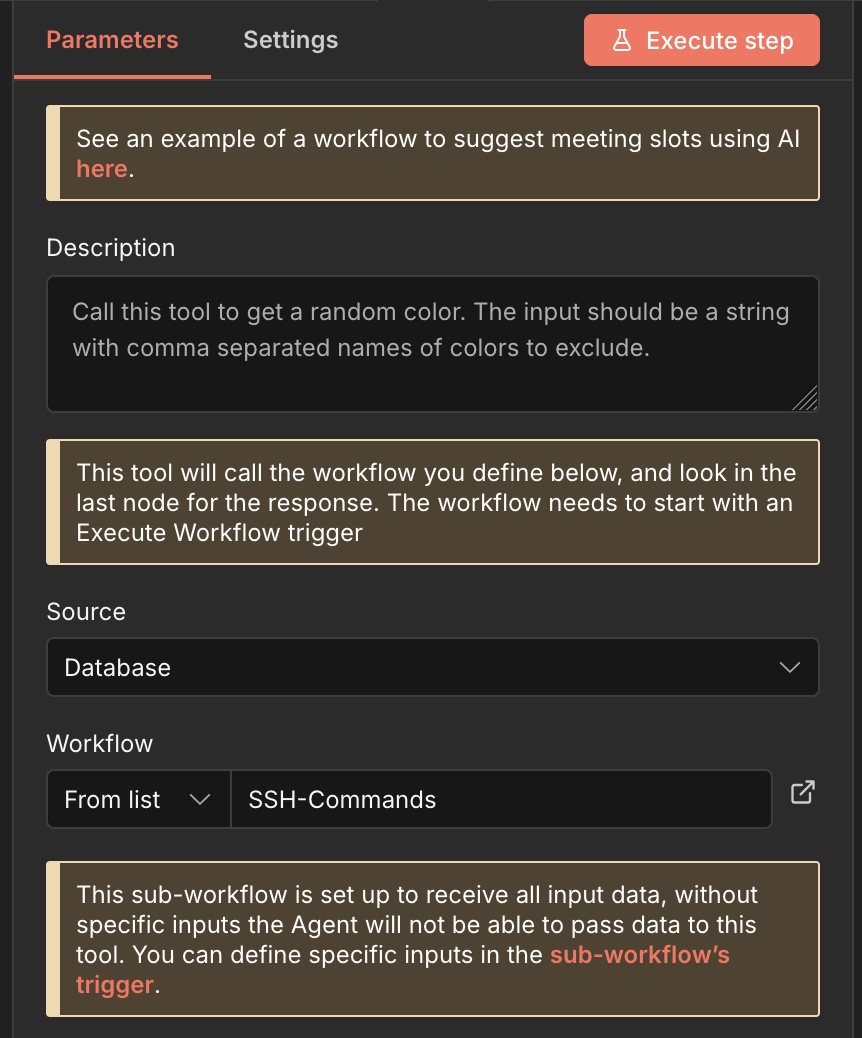 You need to publish the changes you made to the initial sub-workflow (SSH_n8n_server). Try creating “Call n8n Workflow Tool“ and adding your workflow from the list. It should show command now.