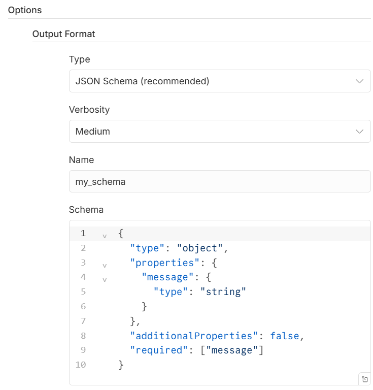 +1 to the JSON Schema approach, that’s the cleanest way. one extra tip — if you’re on the Basic LLM Chain instead of the OpenAI node, you can also add a Structured Output Parser subnode, it handles the schema enforcement automatically without touching Options.