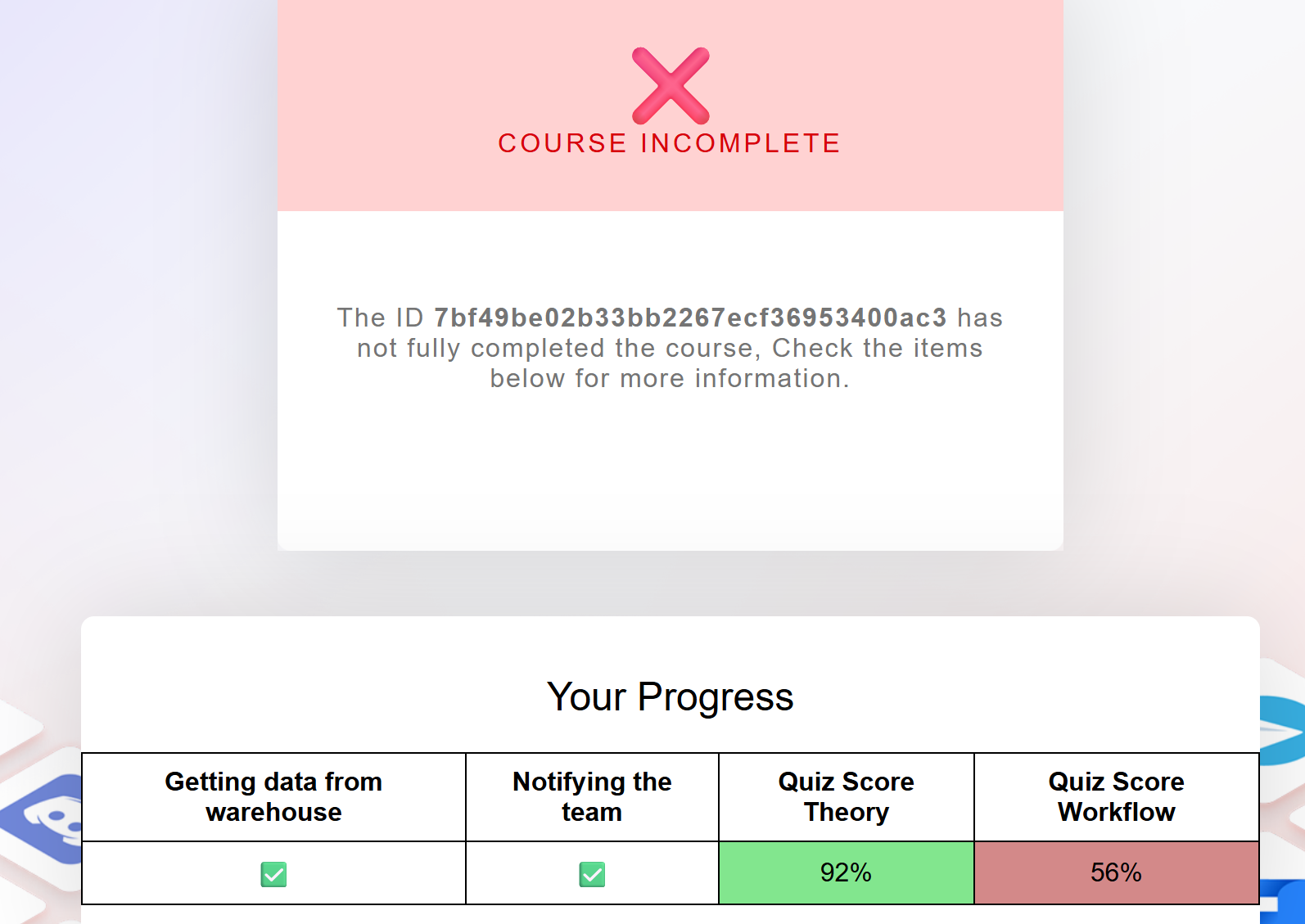 Hey, I completed both parts of the course with > 80%, the mail says all steps are completed and I have both green check marks in the mail. But the mail still says I have to redo the quiz.