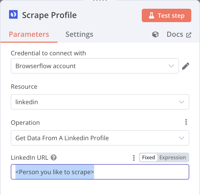 "linkedinUrl": "={{ $('Scrape Profile').item.json.data.url }}",