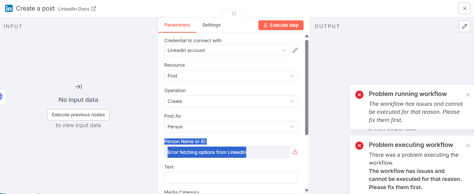 In the node: Error fetching options from LinkedIn under Person Name or ID.