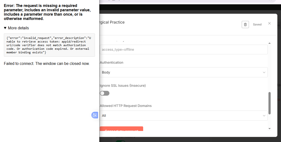 "error_description": "Unable to retrieve access token: appid/redirect uri/code verifier does not match authorization code. Or authorization code expired. Or external member binding exists"