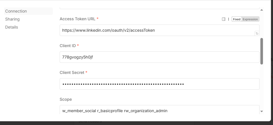 However, when I enter the same client ID, client secret, and redirect URI in n8n, the LinkedIn account connection fails.