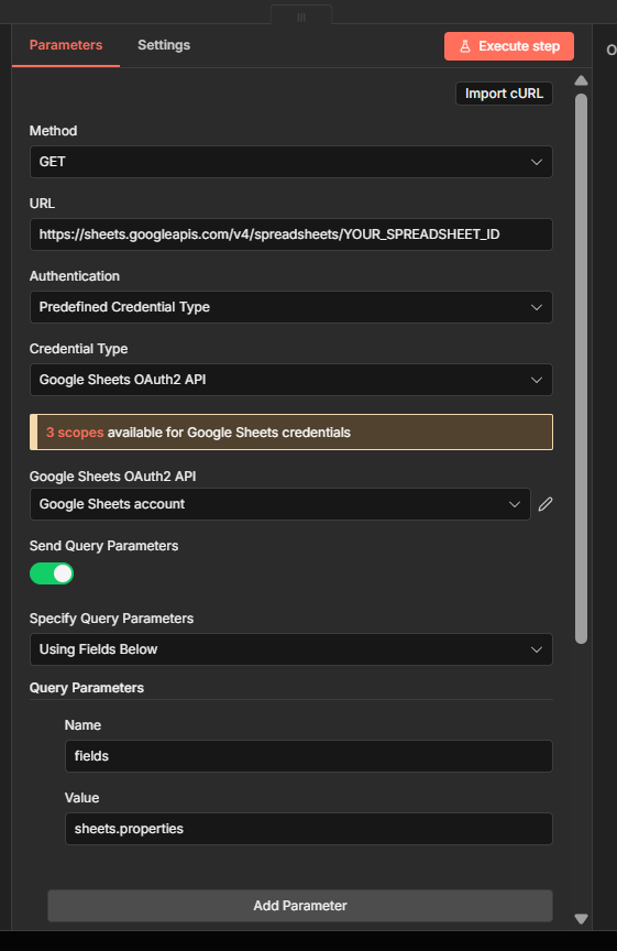 switch to an HTTP Request node (use your existing Google Sheets OAuth creds) and hit this URL: https://sheets.googleapis.com/v4/spreadsheets/YOUR_SPREADSHEET_ID