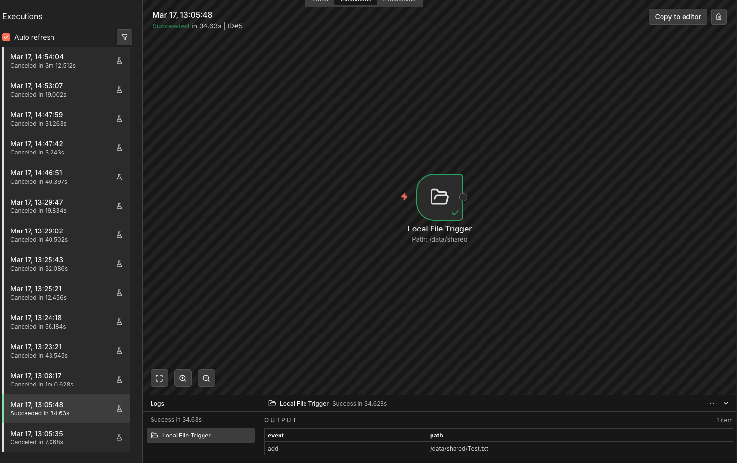 First execution: Node execution > Creation of a Test.txt file in /data/shared > The file appeared in Output = Great, it works