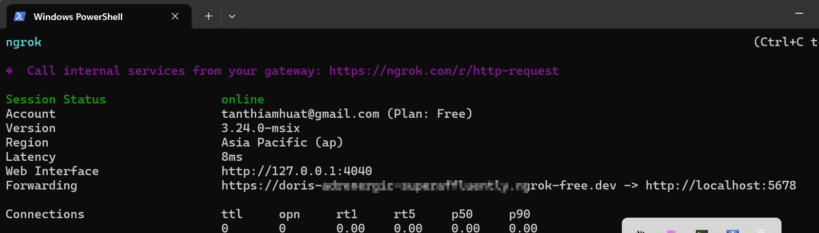 After running the ngrok service(eg: ngrok http YOUR-URL 5678), you will get an URL (like ngrok-random-words.app/dev), that will be your localhost new address.