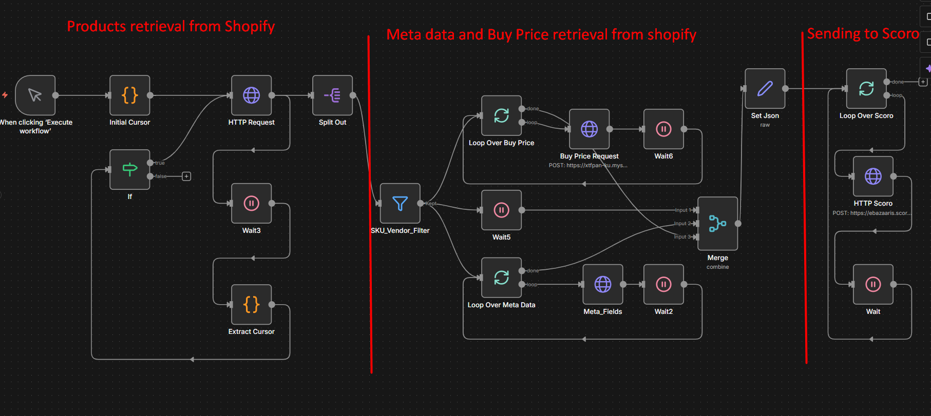 n8n Version: 1.121.3 (Cloud) Goal: Retrieve ~2,600 products from Shopify (via 11 paginated HTTP requests), process them in batches, and upload them to Scoro.