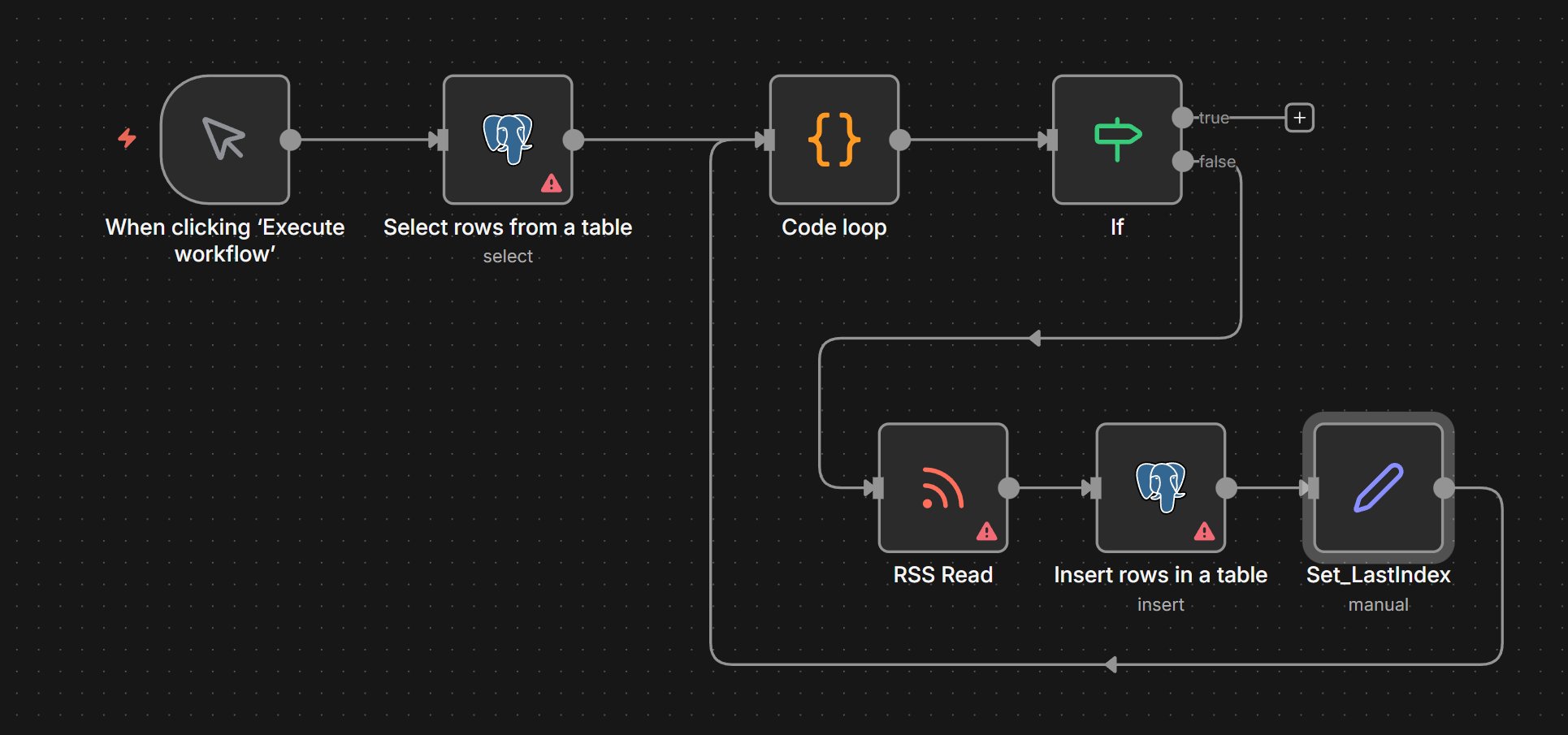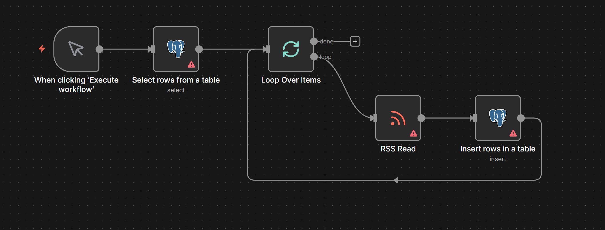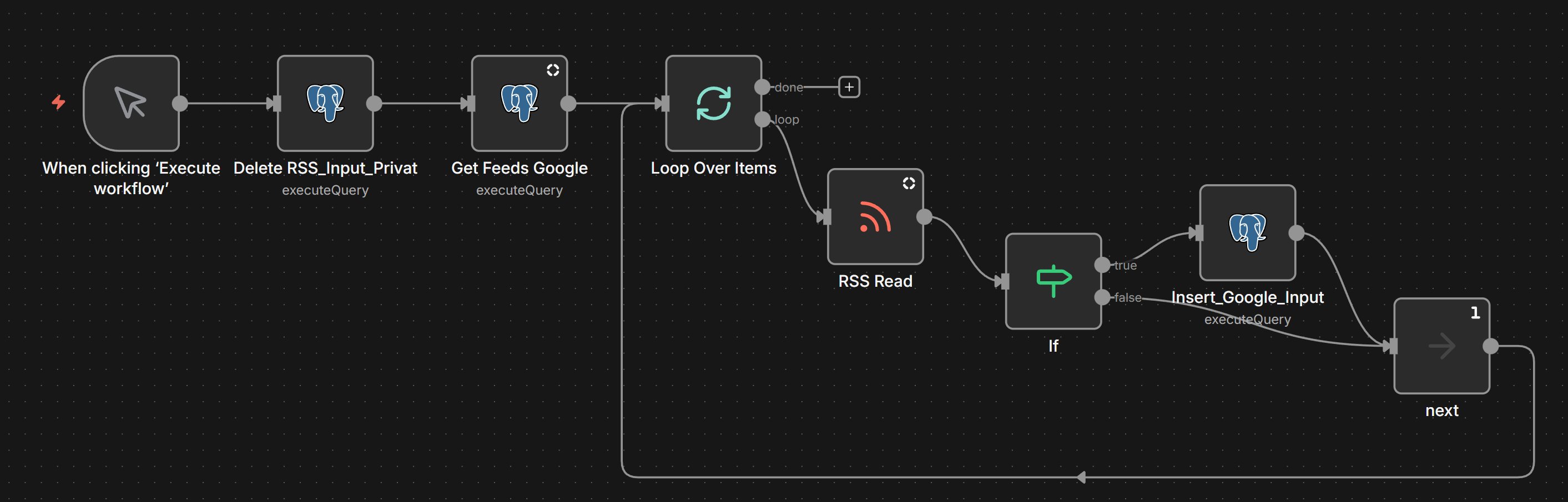 The problem occurs when saving the messages. Example: The Select node returns five records in the following format (feed name, URL, language). The RSS Read node returns 40 messages. With the Insert node, I have to save the messages together with the feed name and language. Unfortunately, I don’t have the assignment, and I can’t see which message comes from which feed request.